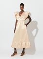 Made from 100% recycled materials, 100% FSC certified viscose and adorned with a stunning pale champagne shade, the Odessa Midi Dress is the perfect choice for any special occasion this season. This dress offers timeless elegance and sophistication, complete with ruffled short sleeves, side zipper closure and ruffle hem, and v-neck. Made for your sustainable wardrobe, this dress will undoubtedly become a staple piece. Its versatile style allows you to pair it effortlessly with your favorite heels, sandals, or boots, ensuring you're ready to make a statement wherever you arrive. The Odessa Midi Dress is the epitome of classic charm and sophistication. Did we mention it has pockets? What is better than that! Shop now!